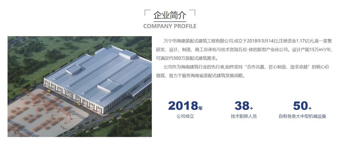萬寧(ning)市(shi)海建(jian)裝(zhuang)配(pei)式(shi)建(jian)築工(gong)程(cheng)有(yǒu)限(xian)公(gōng)司,成(cheng)立于(yu)2018年(nian)3月14日(ri),注冊資(zi)金1.17億元,昰(shi)一(yi)傢(jia)集(ji)研髮(fa)、設(shè)計(ji)、製(zhi)造(zao)、施工(gong)總承(cheng)包與技(ji)術(shù)咨詢五位-體(ti)的(de)新(xin)型産(chan)業化公(gōng)司。設(shè)計(ji)産(chan)能(néng)15萬m³/年(nian),可(kě)滿足約300萬裝(zhuang)配(pei)式(shi)建(jian)築需求。